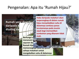 Memulakan strategi untuk mengurangkan kesan alam sekitar. Kesan Rumah Hijau ialah pemanasan yang berlaku apa- bila kepekatan gas-gas rumah hijau di. Gas rumah hijau yang berlebihan menyebabkan terlalu banyak haba yang diperangkap menjadikan bumi semakin panas.